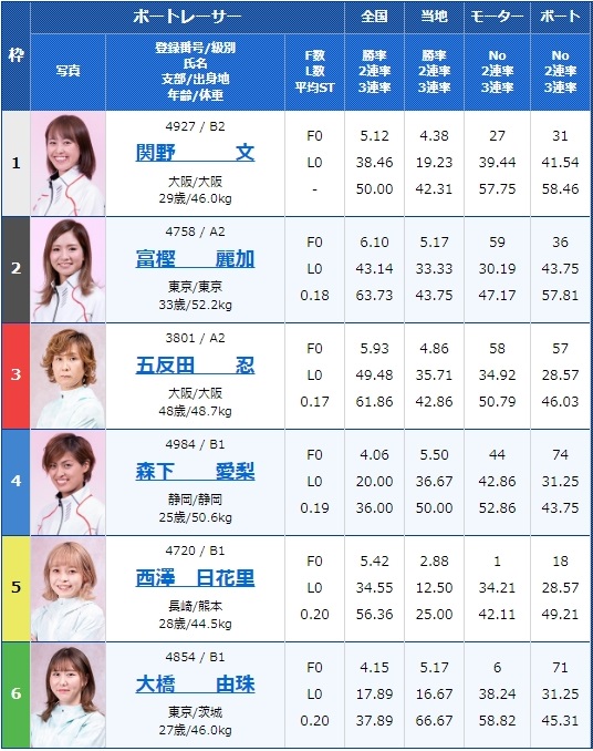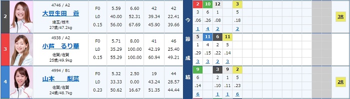 2号艇と3号艇はともにA2の大豆生田蒼選手と小芦るり華選手で、この2人の出方次第でレースが動きそうな感じがします。