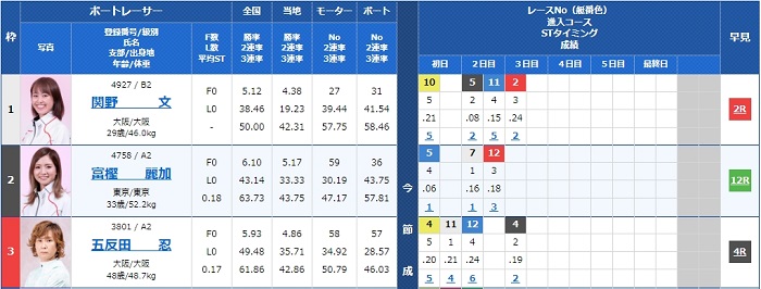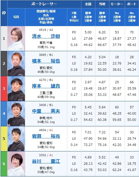 1号艇にはA2の清水沙樹選手が入っていますが、5号艇、6号艇はともにA1の岩瀬裕亮選手と谷川里江選手が入っています。