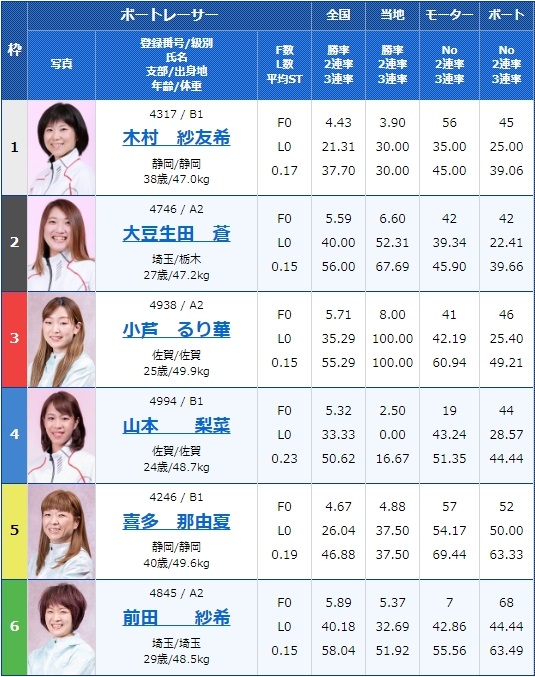 - 【6号艇】:前田 紗希選手(A2/埼玉)