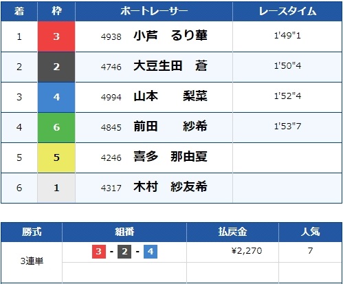 - 【3号艇】:小芦 るり華選手(A2/佐賀)