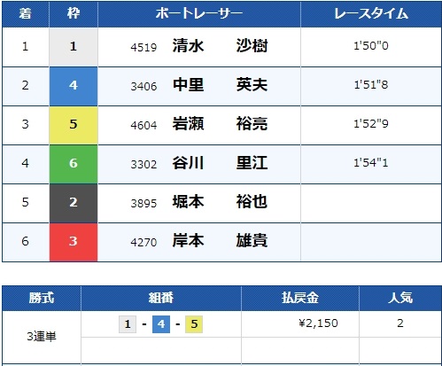公開された予想は、1号艇清水選手を軸に4号艇中里選手、5号艇岩瀬選手に注目した予想となっています。