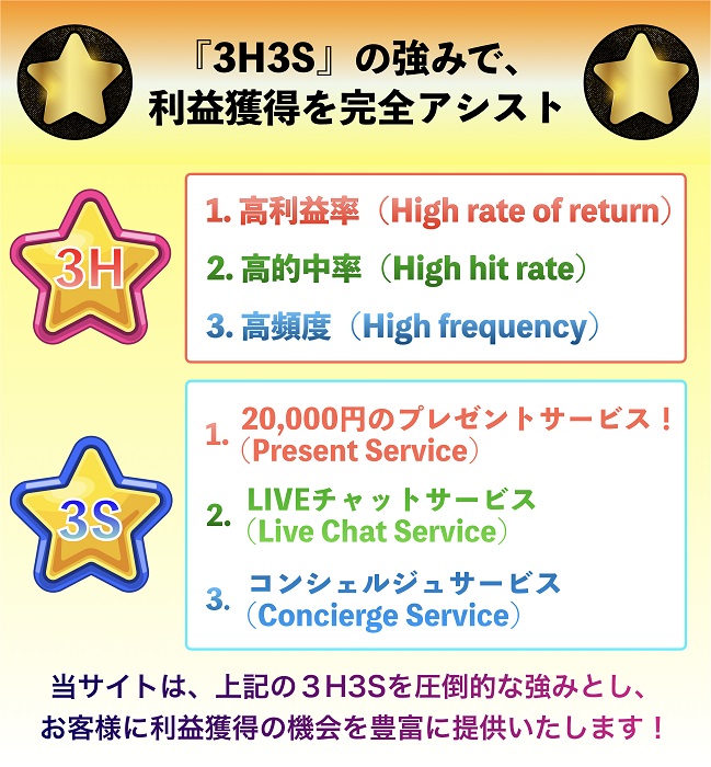 内容を詳しく見ていくと、3Hというのは「高利益、高的中、高頻度」を意味するそうです。