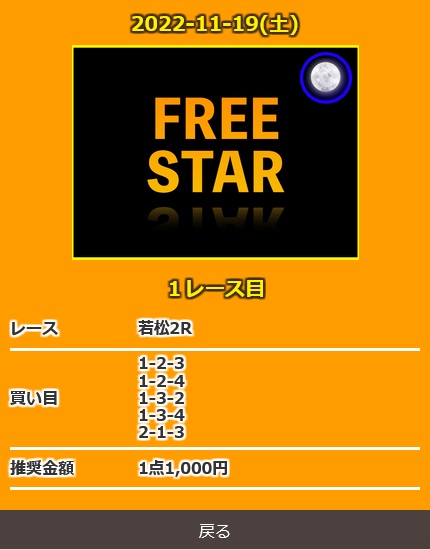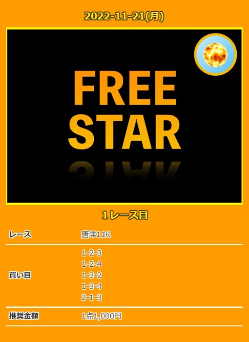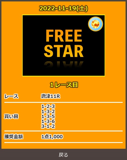 | アルティメットスター | 150万円 | 2レース | 3連単5点前後 | 1点2,000円 | 1,200pt |