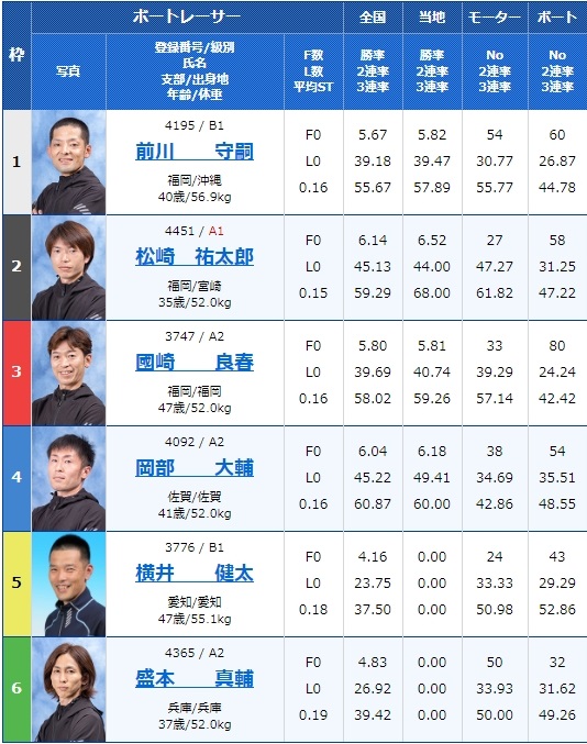 - 【1号艇】:前川 守嗣選手(B1/福岡)