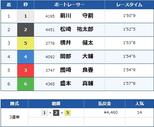 1号艇にはB1ながら勝率の高い前川守嗣選手、また、2号艇にはA1の松崎祐太郎選手が入りこの2選手が人気を集めていました。
