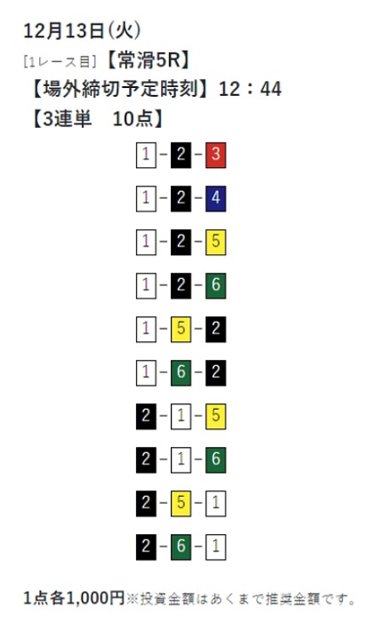 12月13日(火)常滑5Rの無料予想!