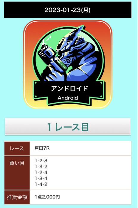 プラン名 目標金額 提供数 点数 投資金額 販売価格 アンドロイド 3万円 1レース 5点 1万円 0pt1点2,000円、目標金額は3万円と無料予想の中では高い設定になっていますね!