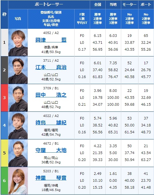 - 【6号艇】:小坂 尚哉選手(A1/兵庫)