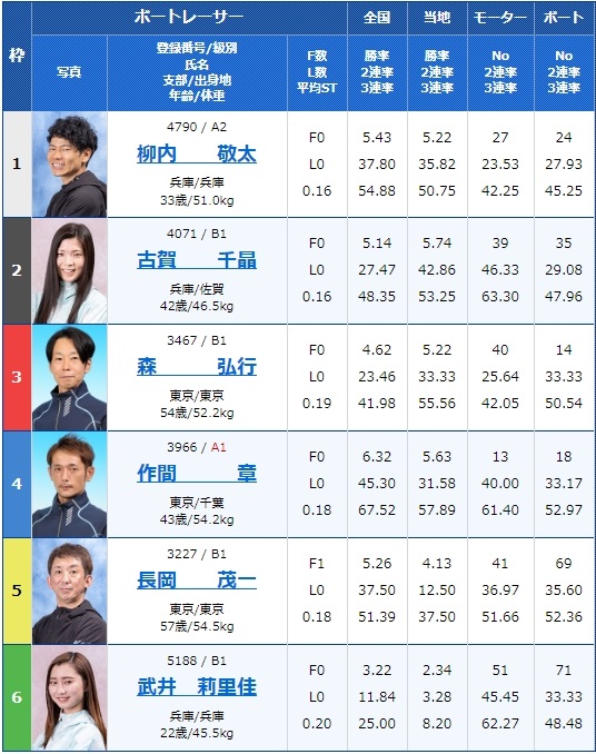 - 【1号艇】:柳内 敬太選手(A2/兵庫)