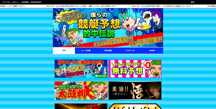非会員ページは僕らの競艇予想の最大の特徴とも言えるアニメキャラクター風のイラストが広がっています。