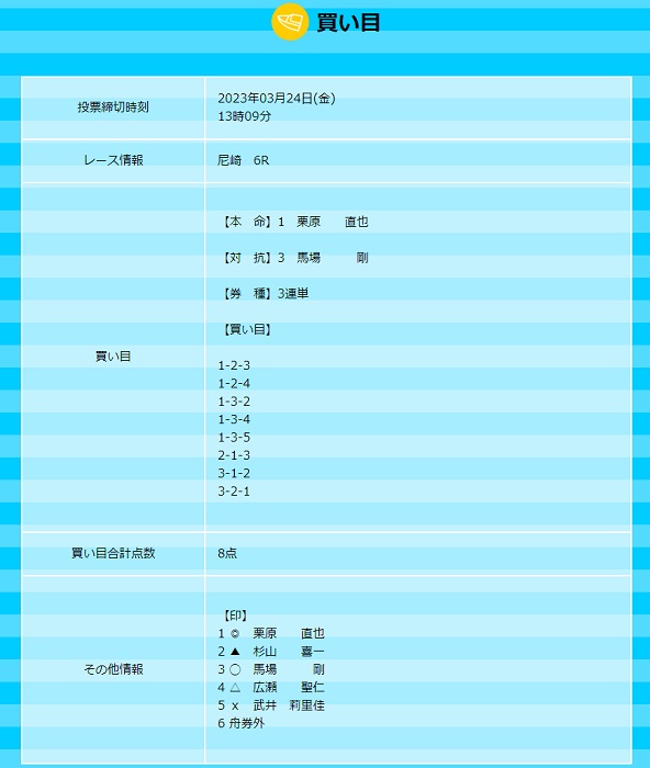今回予想が公開されたレースは尼崎6Rです! 公開された買い目とオッズは以下の通りです。