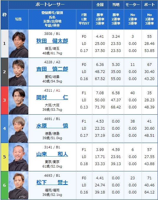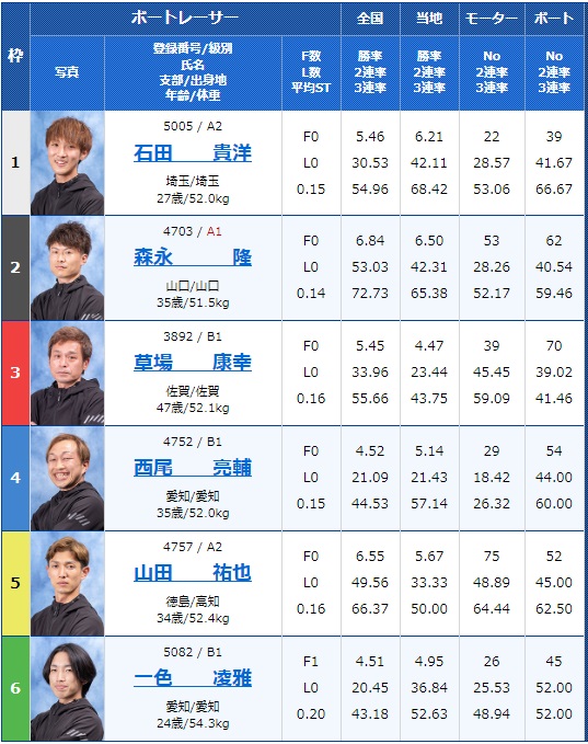 一方で4号艇山本選手や6号艇寺本選手も実力はある選手、スタートが乱れればチャンスもありそうです。