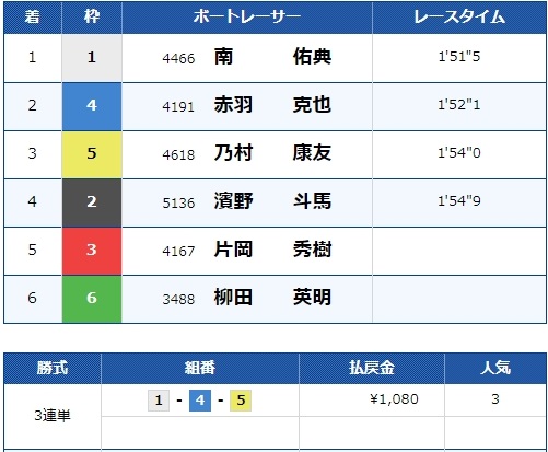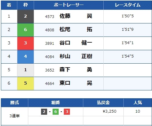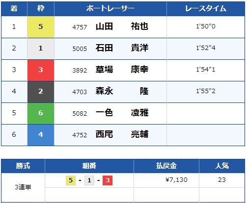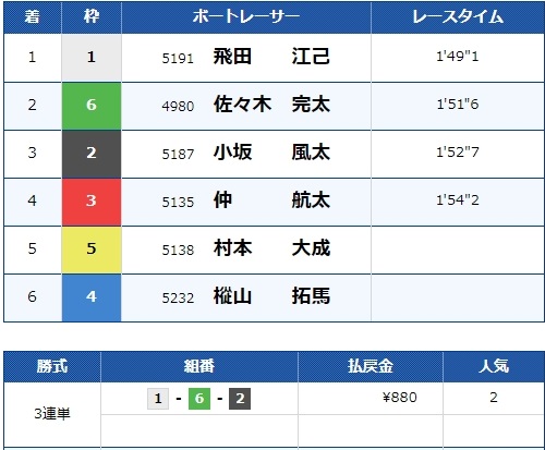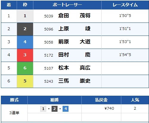 また、注目していなかった2号艇森永選手は競り合いに負けて4着に。