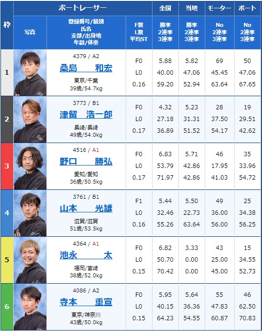 このレースは1号艇にA2桑島和宏選手、3号艇にA1野口勝弘選手、そして5号艇にA1池永太選手と奇数艇に強力な選手が集まっていますね!