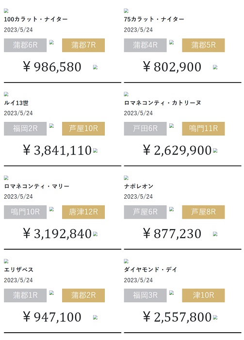 | ロマネコンティ | 500万円 | 2レース | 3連単6点前後 | 2万円 | 5,000pt |