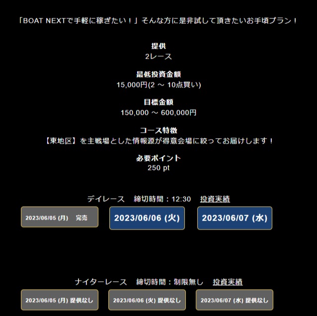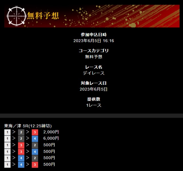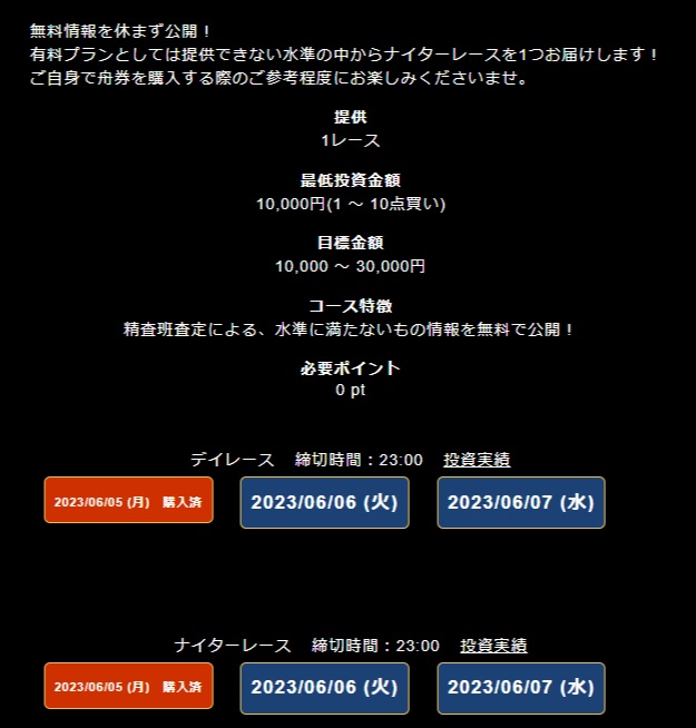 非会員ページにはデザインには力を入れておらず、その理由を「予想意外の余計な部分にお金をかけない」などいっちょ前に書いていましたが、肝心の予想も企画レースで1号艇を軸にするガチガチの予想をしておきながら、2レース連続ではずすというレベルの低さ。