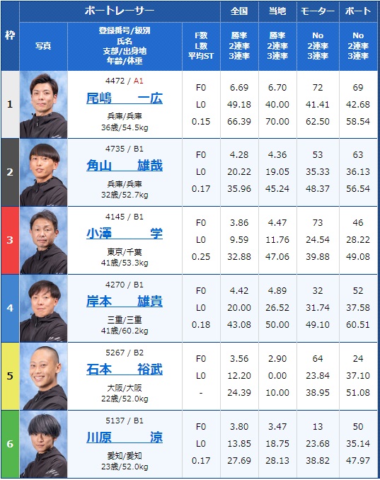 - 【1号艇】:尾嶋 一広選手(A1/兵庫)