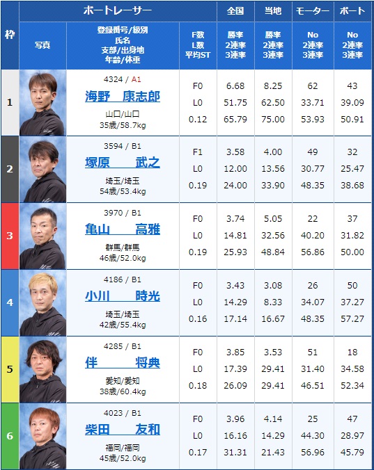 3号艇亀山選手と6号艇柴田選手のモーターが2連対率40%超えとかなりいい感じです。