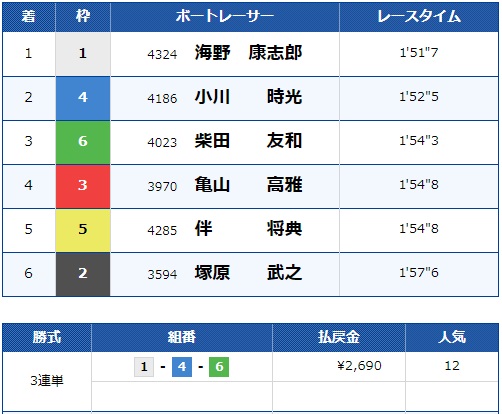 オッズも26.9倍、A1級の選手が1号艇で1着なのにかなり美味しいレースでした!