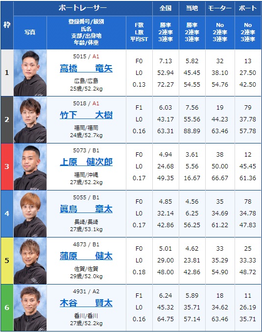 - 【2号艇】:竹下 大樹選手(A1/福岡)