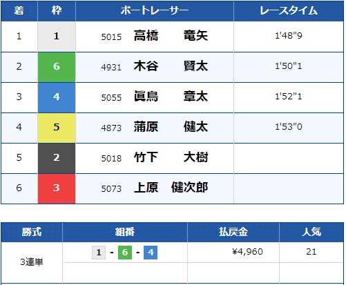 - 【6号艇】:木谷 賢太選手(A2/香川)