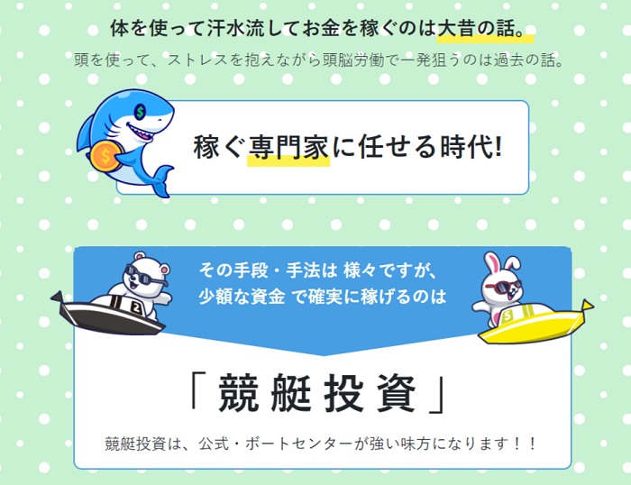 ボートセンターは競艇を投資として捉えているようで、少額な資金で確実に稼げると言っています。
