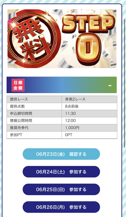 | STEP1 | 25万円 | 2レース | 8点前後 | 1点2,000円 | 20,000pt |