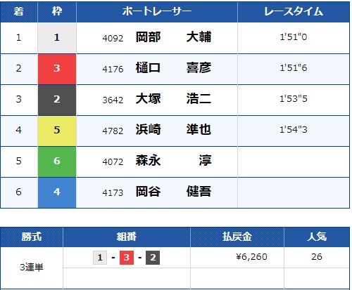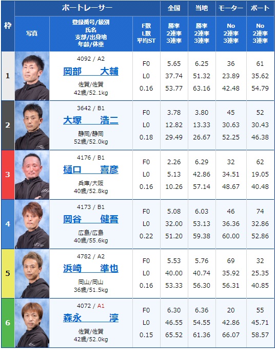 - 【1号艇】:岡部 大輔選手(A2/佐賀)