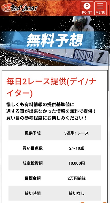1日2レース×目標金額2万円!「マックスボート」の無料予想の概要