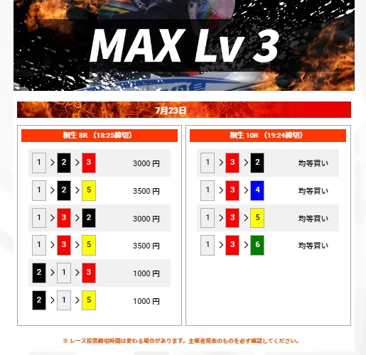 | MAXLv3 | 30万円以上 | 15,000円 | 3連単2レース | 2~10点 | 330pt | |