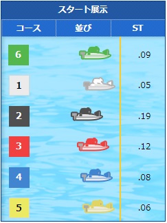 このレース、6号艇のB1西田靖選手が前付けの動きを見せており、なんとスタート展示では1コースを奪取しています!