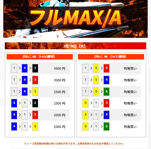 | フルMAX/A | 20万円以上 | 15,000円 | 3連単2レース | 2~10点 | 200pt | 初回限定プラン |