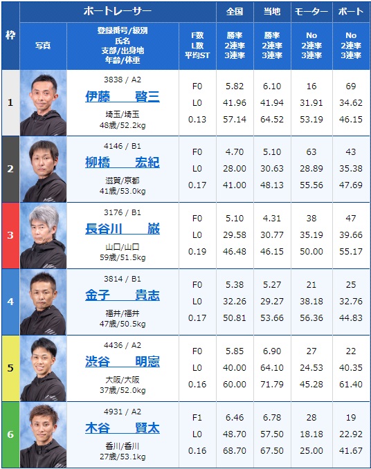 ただB1西田選手は実力、モーター的にちょっと苦戦が強いられそう、実力で言えば1号艇A2渡辺豊選手と3号艇A2一瀬明選手が抜けています。
