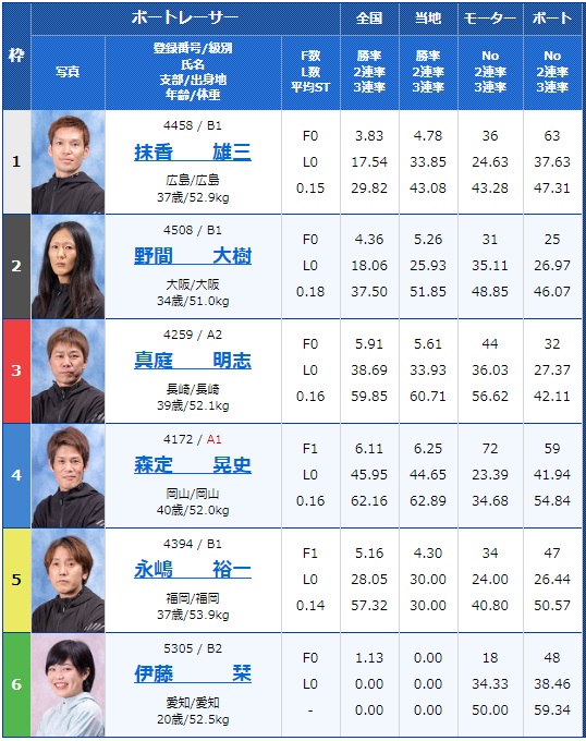 1号艇、2号艇はもちろん枠有利ですが、ともにB1級の抹香雄三選手と野間大樹選手と実力で見れば少し劣っていますね。