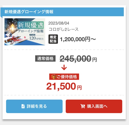 | 新規優遇グローイング情報 | 120万円 | 2レース | 6~10点 | 2万円以内 | 245,000円 |