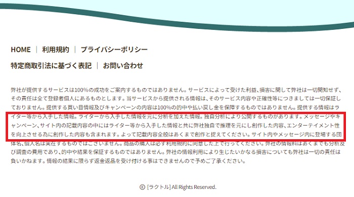 そのため、的中実績を捏造していたり、お客様の声を捏造していたりしても、「エンターテイメント性を求めた創作です。」と言われてしまえばなにも言い返せないのです。