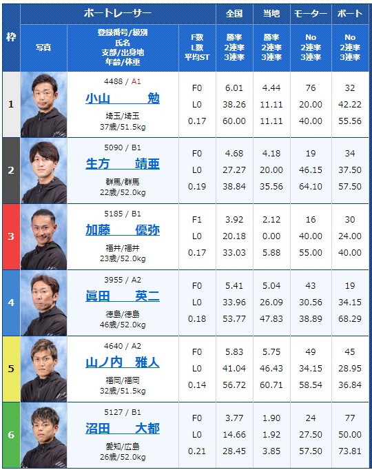 - 【5号艇】:山ノ内 雅人選手(A2/福岡)