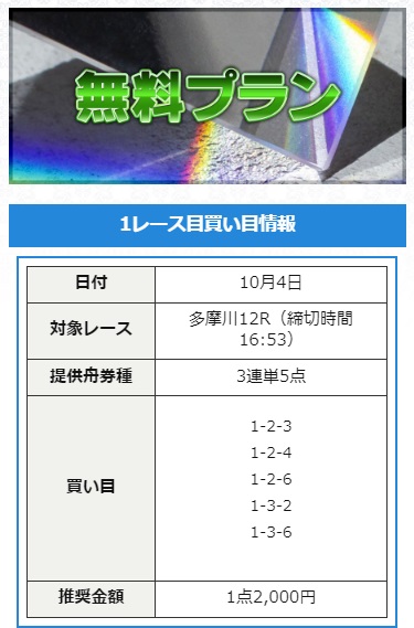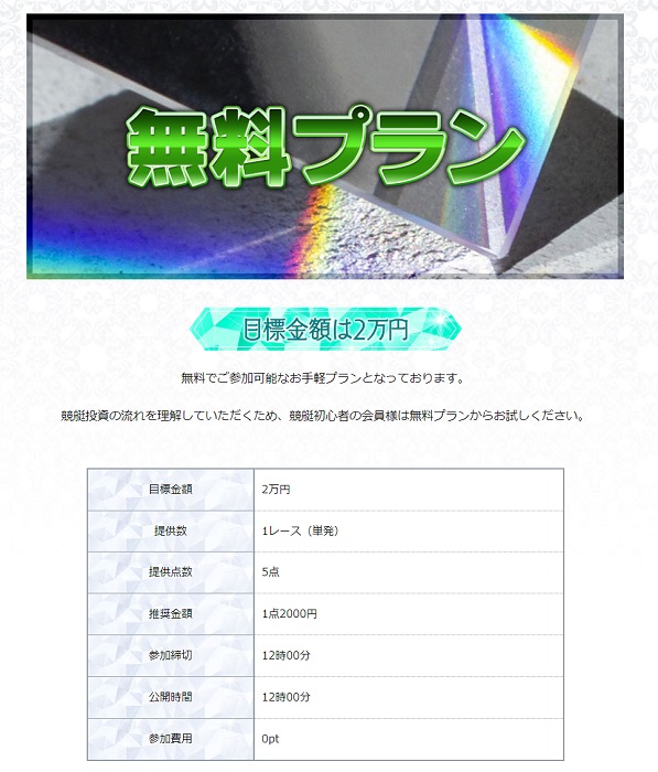 プラン名 目標金額 提供数 点数 投資金額 販売価格 無料プラン 2万円 1レース 5点 1点2,000円 0pt無料予想の設定に関しては悪い点はありませんね。