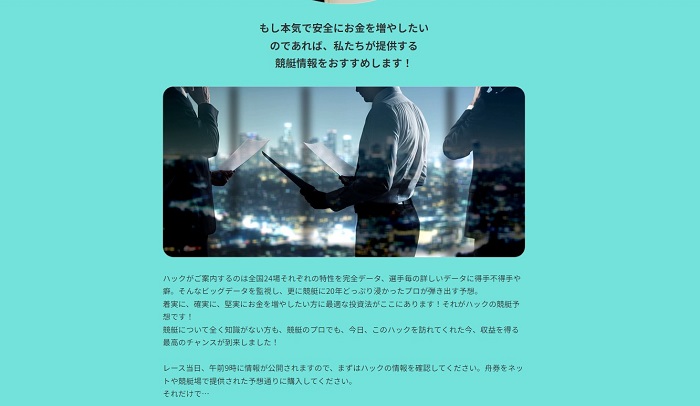 書かれていることを見てみると、「競艇に20年どっぷり使ったプロが弾き出す予想」など、かなり抽象的で曖昧な記載となっています。