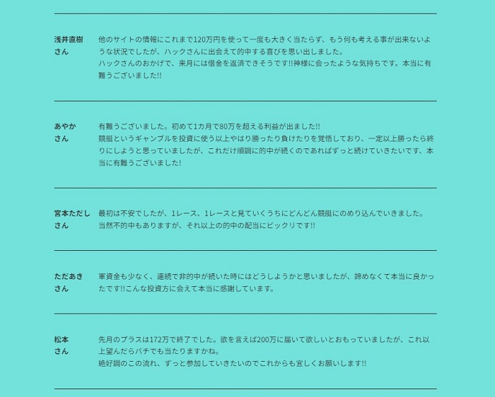 有料予想は早速大幅値引きされていたり、お客様の声はおそらく捏造されていたりとやりたい放題です! ハックはとにかく悪質ポイントが満載の「悪質サイト」です!