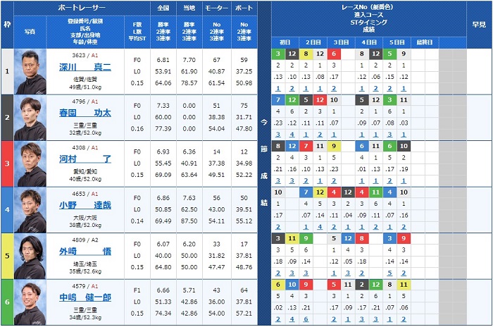 - 【1号艇】:深川 真二選手(A1/佐賀)