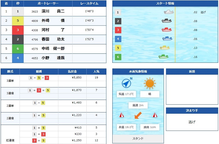 公開された予想は、1号艇深川選手を軸に4号艇小野選手と5号艇外崎選手に注目した予想となっています!
