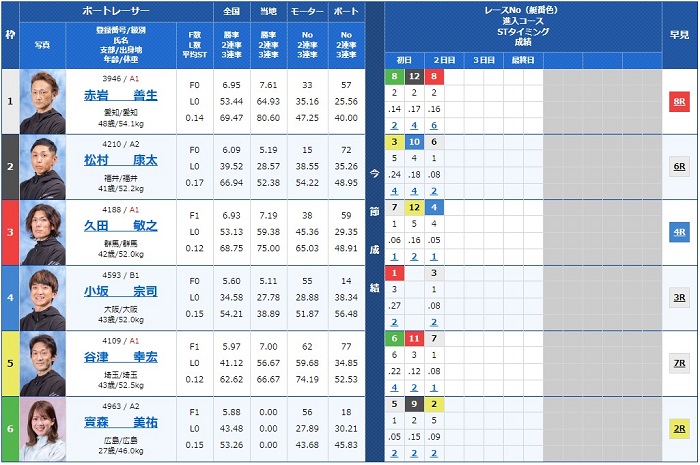 - 【1号艇】:赤岩 善生選手(A1/愛知)