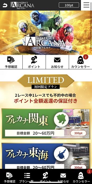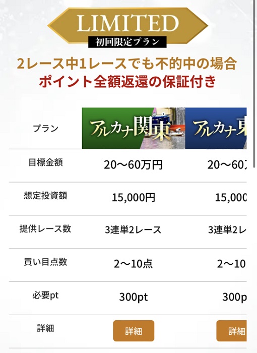 | アルカナ(5地区別) | 20~60万円 | 15,000円 | 3連単2~10点 | 2レース | 300pt | 初回限定プラン |
