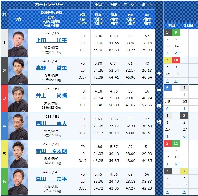 - 【5号艇】:西村 豪洋選手(B1/愛知)