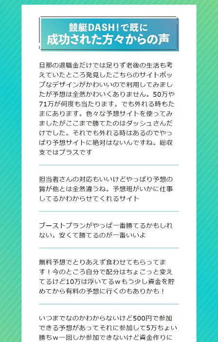 競艇ダッシュ、非会員ページに書いてあった内容はしっかりしていて良いサイトかと思いきや、非会員ページの最後に「競艇ダッシュで既に成功された方々の声」というコーナーが設けられていました!