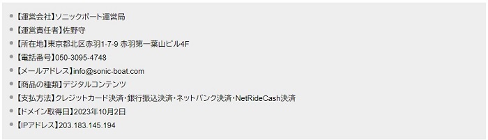 音速に姿を変える前のソニックボートは、住所が他の悪質サイト「クイックボート」などと一致していた点も悪質サイトだと見られるポイントの一つでした!