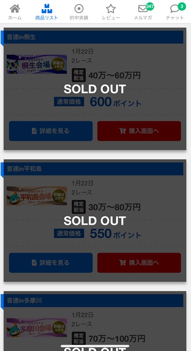 プラン名を見てみると、「音速in桐生」や「音速in平和島」となっているため、どうやら音速は競艇場別のプランを販売しているようです。