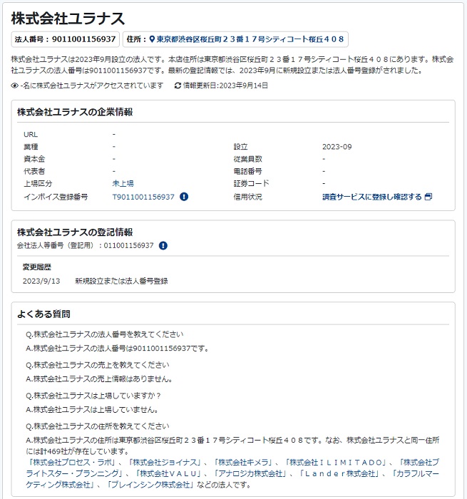 しかし、株式会社ユラナスについての情報を調べてみると、同じ住所を利用している会社は全部で470社あるとのことでしたw