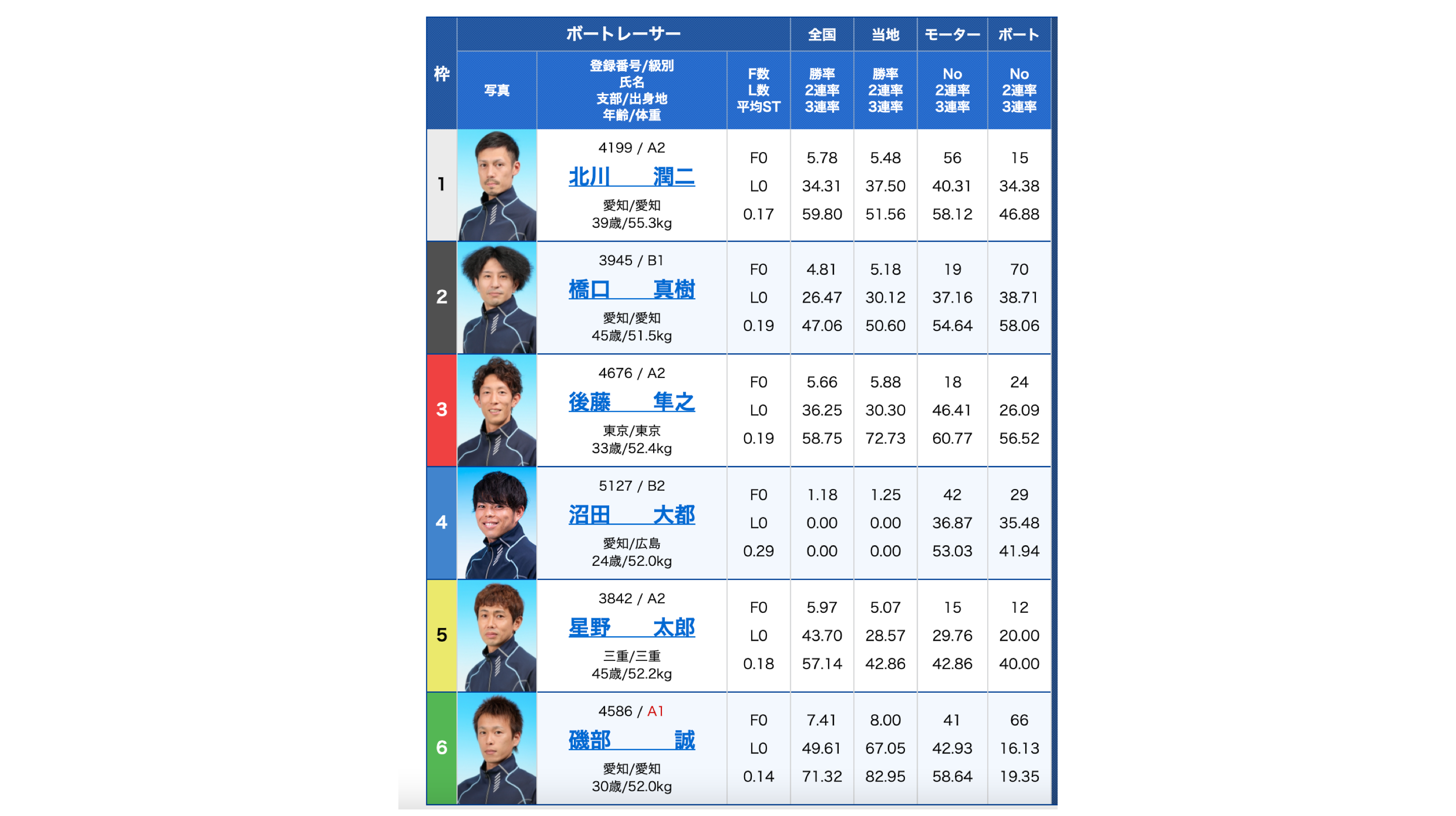 2号艇A2級是澤孝宏選手のモーターの方が41.38%と高いため2号艇1着になりそうです。